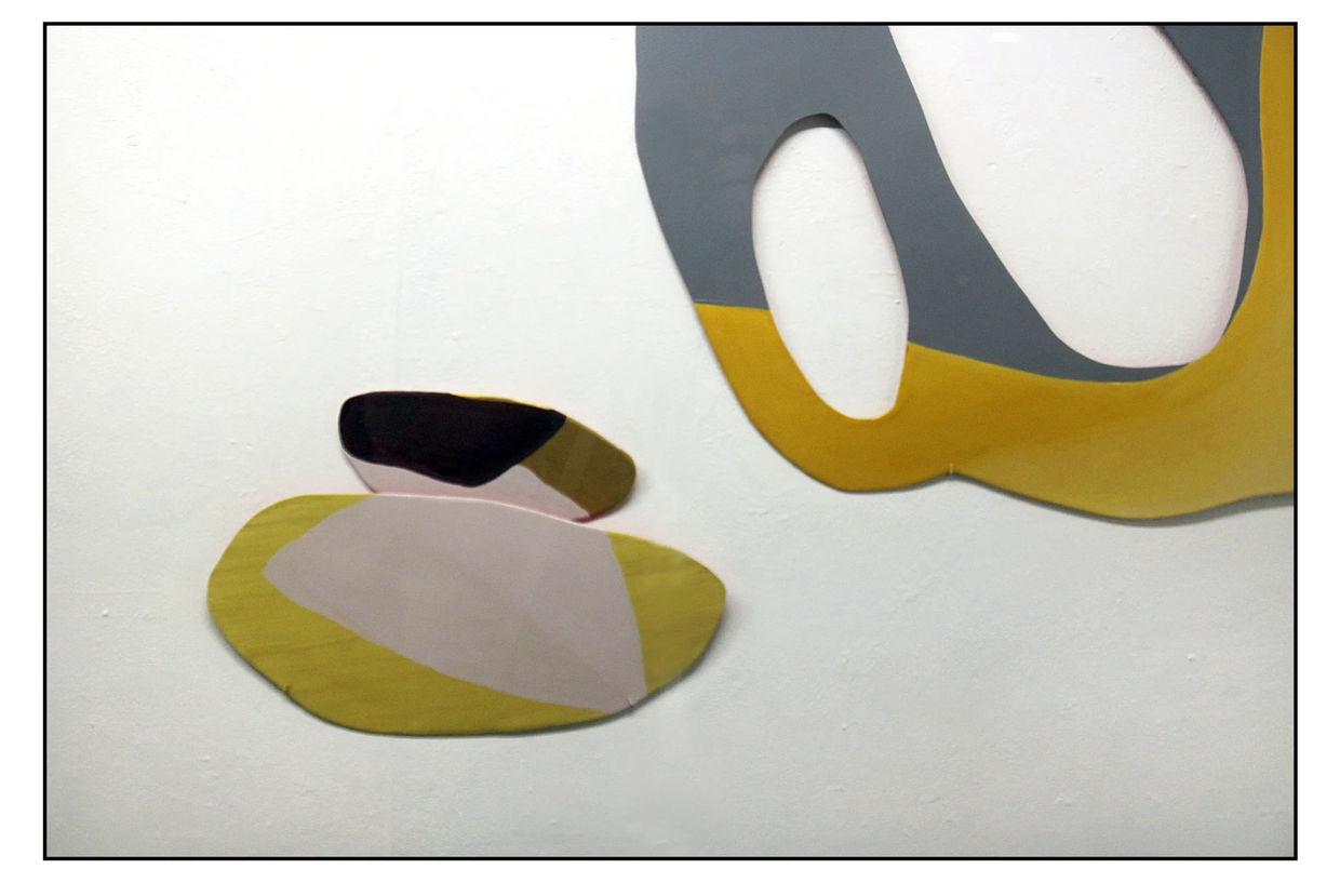 In this piece the wall space around the work has been artfully “sculptured” into a form of equal importance to the objects that make up the exhibit. And it is an art of dance. A painted colour unfinished leaves a colour behind that pushes a form back while correspondingly the wall pushes forward. At another moment holes cut in the work offer lagoons of white wall while off shore two islands of colour seem to have been deposited,