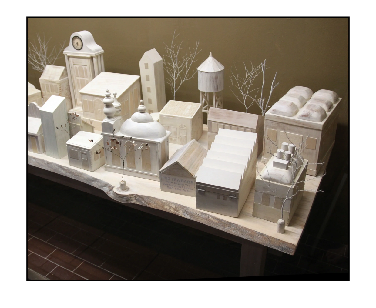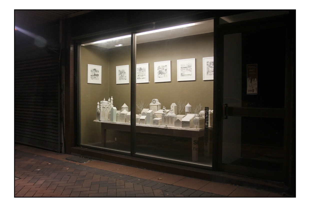 Kathryn Ortan’s engaging street scene neatly fills the floor space of SLOT. A Street beside a street inviting our gaze down and into the gently rendered spaces of another place. It is part documentation, part memory and part invention. Kathryn explains that she has reconstructed the main street of a small town with buildings remembered from her various visits to Europe and from her travels in Australia. An unlikely combination gently approaching the surrealism of building European styled towns in the Australian bush. It was first exhibited at the Wollongong City Gallery. Here Kathryn’s subject, the spaces we dwell in is expanded through drawings to include the hillside side suburbs of Wollongong. She observes literally as a landscape artist while metaphorically fashioning corners that trap our gaze with seemingly poignant detail.