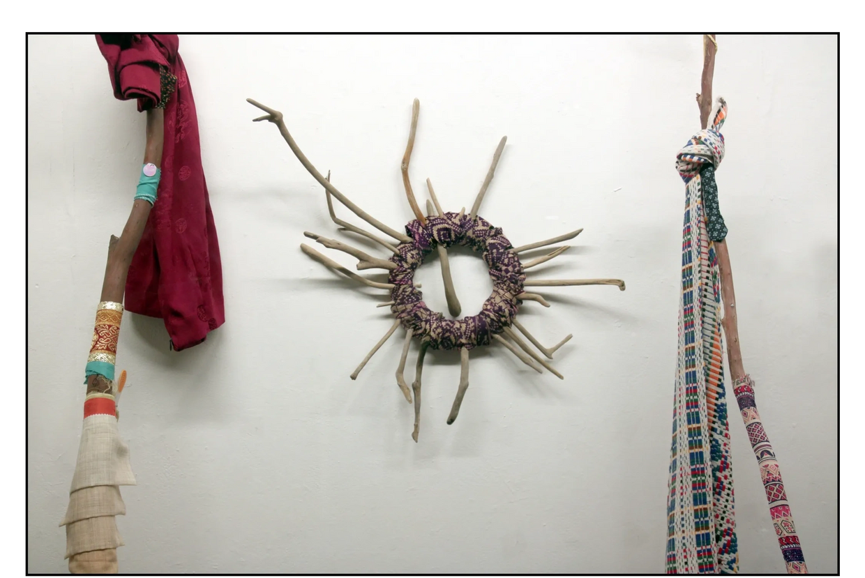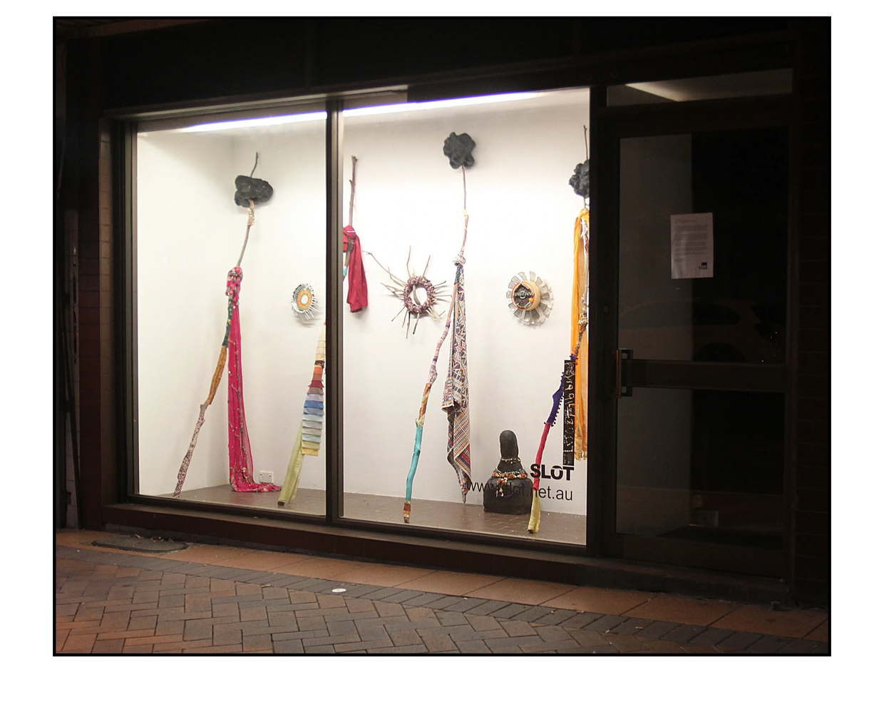 This exhibition that gracefully fills the window space is in fact 3 works. They are the product of a dialogue between Catriona Stanton and. Anne Ooms, student and teacher. Catriona completed a Masters Degree at Charles Darwin University where Anne was her supervisor. Since then they have maintained their dialogue through collaborative exhibitions Their second, at Wollongong University gave us these works and another that has been short listed for this years Blake Prize. Their academic dialogue has become a professional one.