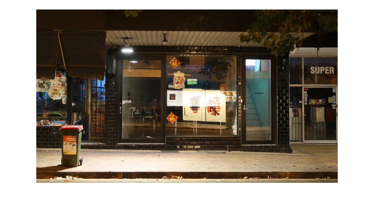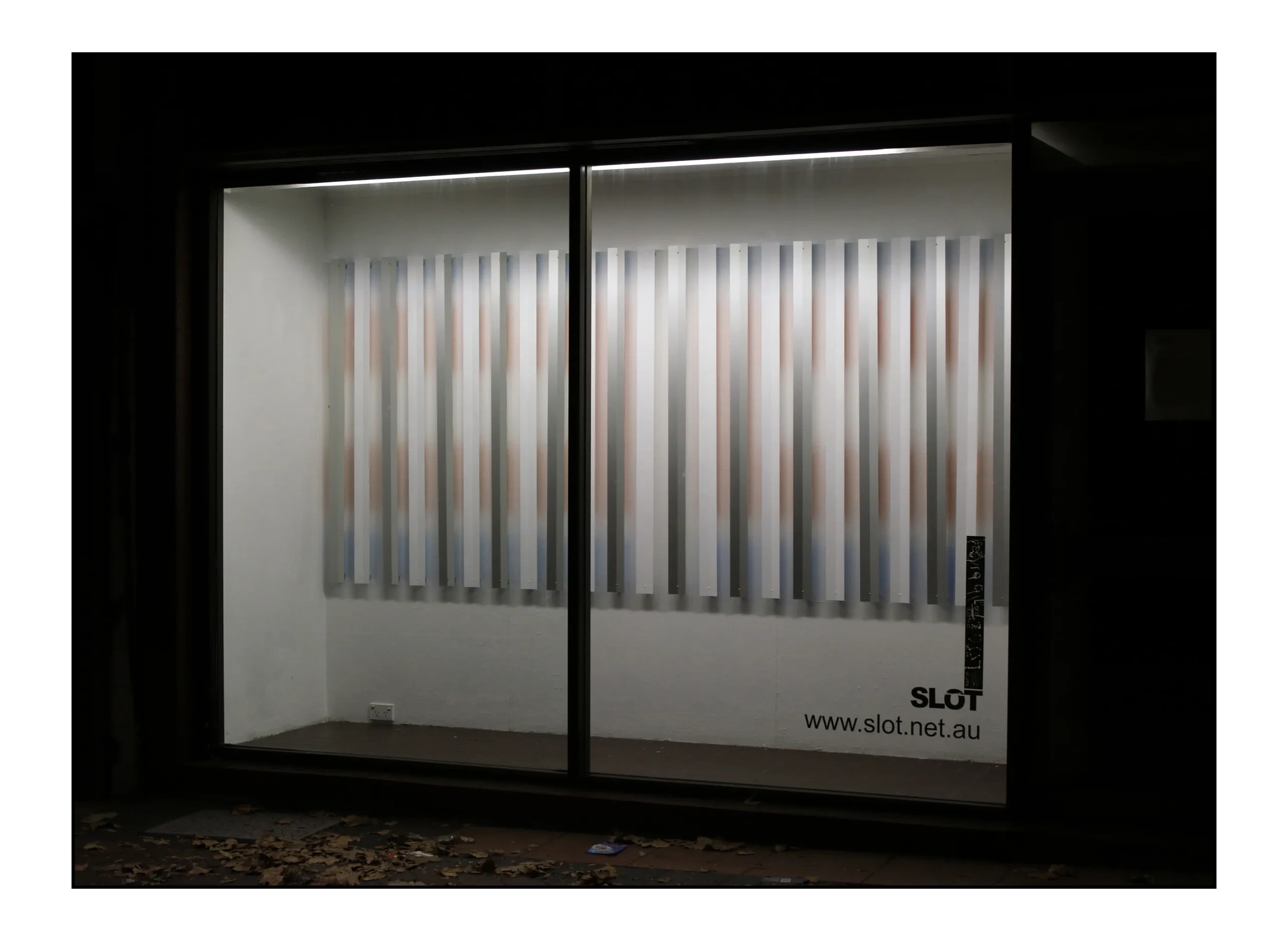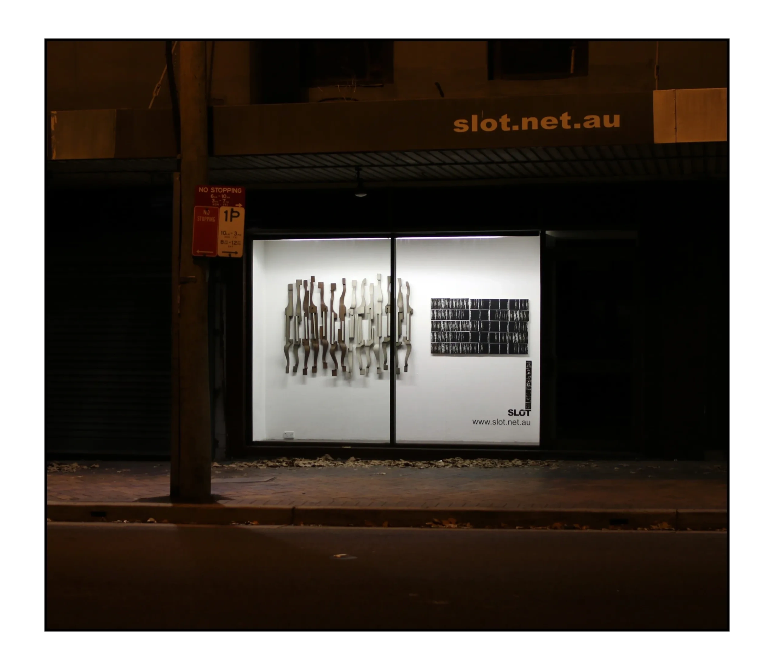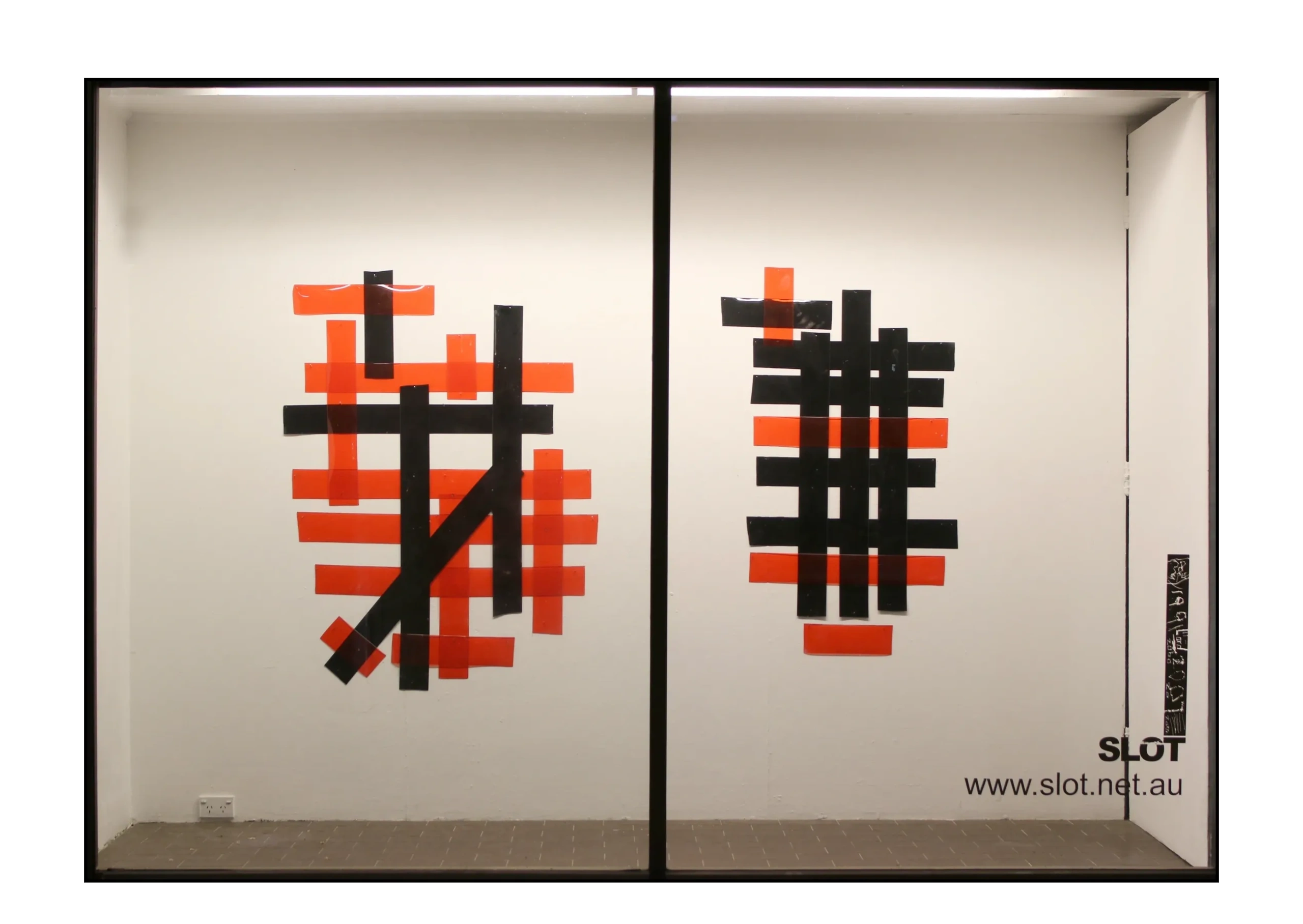 People often enjoy seeing the street reflected in SLOT exhibits. With this exhibit I can’t help seeing SLOT reflected in the window of the Vietnamese restaurant opposite where Ro’s linear constructions sits comfortably with the calligraphic window decorations. It provokes the idea that painting is simultaneously intimate and universal, an allusion and a fact that can be both an accident and a revelation.