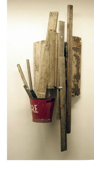 From Roger’s point of view the art work, this art work, already existed in the pile of material collected in his studio. It may have “matured” as it waited to be assembled, but for Roger the art was found through the workman like process of assembling the various elements into a form proposed by the elements themselves. There may be some irony in filling a fire bucket with fire wood. One bucket seems to be a reflection of the other, a paradox underlined by the title – Fire, the fire men. The art here is a record of Roger’s thinking, laid bare in an object that also exposes something of its life before Roger’s art making.