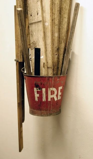 As this work, Fire, fire men was installed Roger explained that he was tired of spending huge sums of money on art materials. Instead, he wanted to make art from what ever came to hand. He wanted to make art for free. In this case from a pile of discards that he had collected over time from the streets around his studio. A couple of fire buckets and a pile of timber. Items that could simultaneously be dismissed as rubbish and valued as treasure.