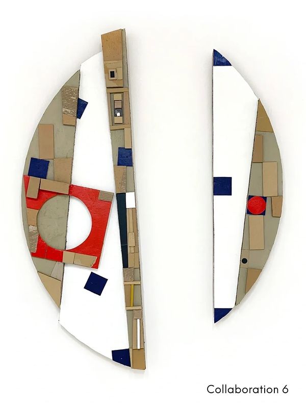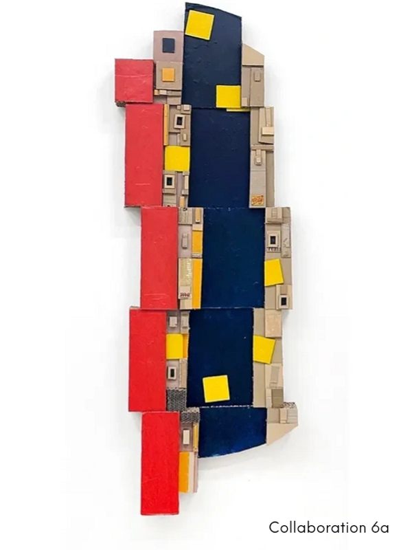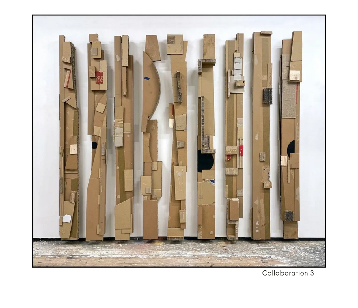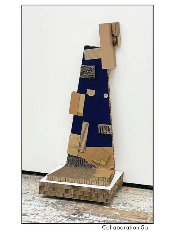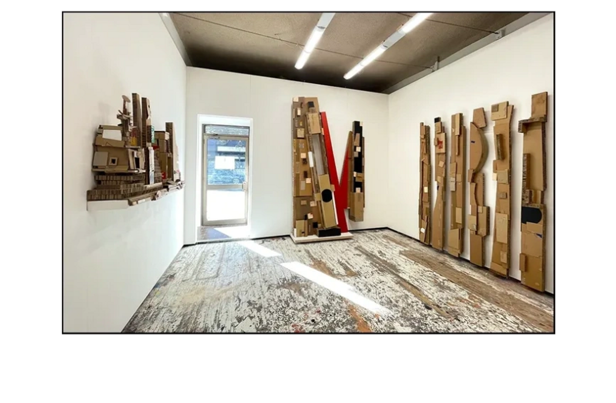 his box cutter, sticks of glue and his glue gun. I realised that the bundled cardboard had been prepared as a series of propositions. As summer wore on and constructions started appearing it occurred to me that my role in the project was that of “realisateur”– a French word meaning movie director, the author who crafts a script into an apparent reality. With work coalescing, usually where Fredi had left a proposition, I began applying paint. Being painted is a distinction between my work and Fredi’s – his isn’t - mine is – but that might change, suggesting an objective to this collaboration. To approach a conclusion, that neither of us would have considered without the intervention of the other.