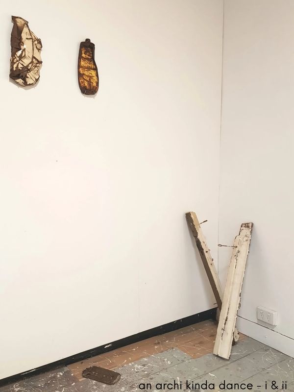Collaboration comes in many forms. One extreme could be the 1982 collaboration of Imants Tillers and John Nixon, Honour and Glory that superimposed a Nixon image on the corner of a Tillers painting. It maintained the identity of each artist. Another extreme could be the work of the Filipino collective, Sanggawa that produced mural sized paintings seemingly executed by a single artist. This collaboration began on Sunday evening when we were sitting with the cardboard drinking red wine and eating pizza. I went to bed. In the morning on my way to buy breakfast I stopped and looked. The chaos was transformed – art works were loosely propped against the walls as bundles of cardboard – our project could have been completed while I slept.